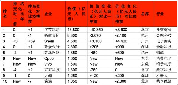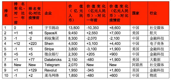 相较一年前,三家企业新晋前十:总部广州的快时尚电商Shein、深圳的数字银行微众银行,以及迪拜的通讯应用Telegram。它们取代了总部斯德哥尔摩的金融科技公司Klarna、悉尼的设计软件公司Canva和旧金山的生鲜配送平台Instacart。