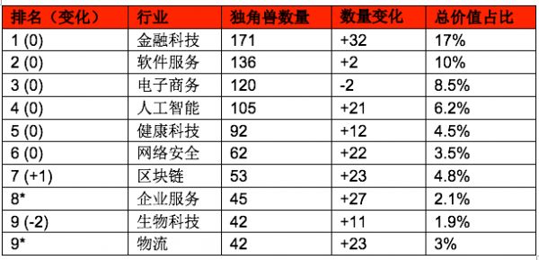 从独角兽数量来看,增长最快的行业是金融科技、企业服务、区块链、物流、网络安全和人工智能。