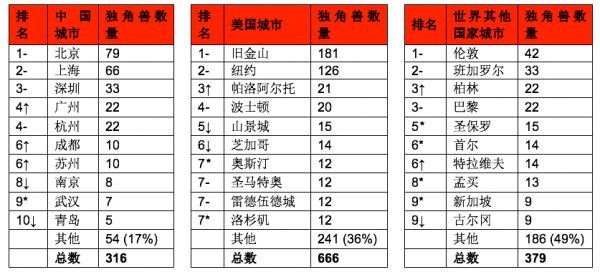 中国前十大城市独角兽企业的集中度最高,为83%;其次是美国,为64%;世界其他国家为51%。