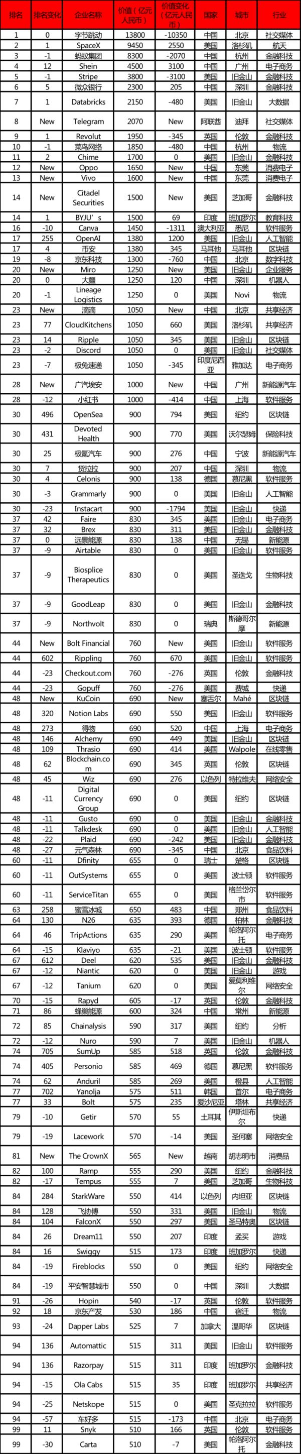 总部旧金山的数据和AI公司Databricks上升一位,至第七,价值2150亿元人民币。总部迪拜的通讯应用Telegram跻身前十,价值2070亿元人民币。
