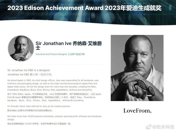 据IT之家,前苹果设计总监Jony Ive近日荣获了2023年的爱迪生成就奖。