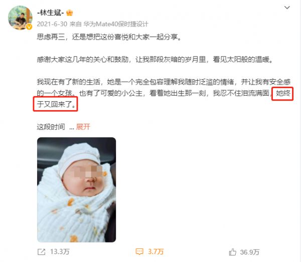 他发布了一条微博,宣布了自己有了新欢并生下一个女儿的喜讯。