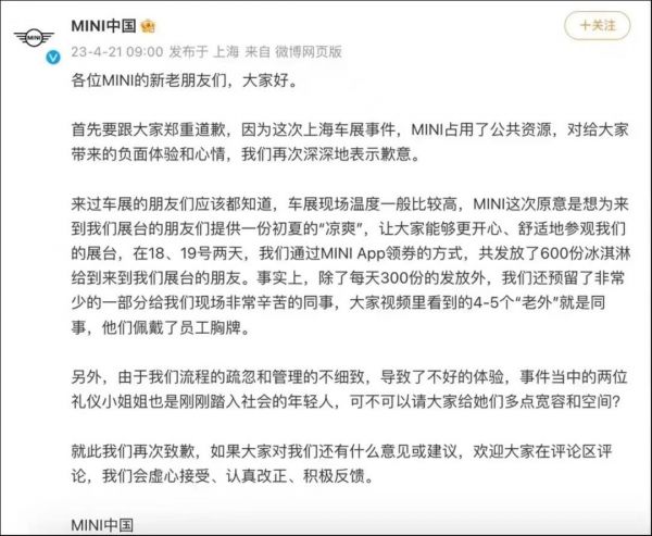 为了表达诚意,4月21日早上9点,MINI中国官方微博针对车展冰淇淋事件再次发文致歉,称视频里看到的4-5个“老外”就是同事,他们佩戴了员工胸牌。以下为致歉内容全文: