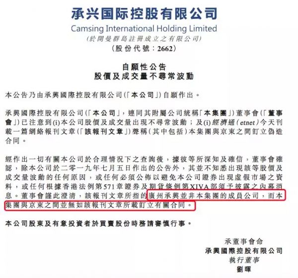 不仅京东方面否认,昨天下午,承兴国际控股也回应称:外界报道所指的广州承兴并非公司成员公司,公司与京东之间并无如该消息所称订立有关合同。