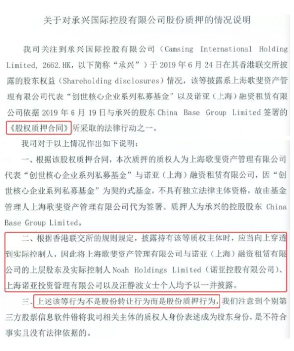 1、诺亚财富不是承兴国际控股的股东,这不是股权转让,而是股权质押。