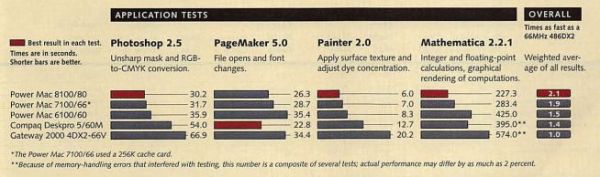 1994年3月,Power Macintosh 6100/7100/8100正式发售,作为首批搭载PowerPC处理器的Macintosh电脑,它们的性能远远超越了之前的摩托罗拉68K系列的苹果电脑,根据MacWorld的测试,在运行软件时,三台Power Macintosh的性能都大大优于搭载顶级奔腾处理器的电脑。