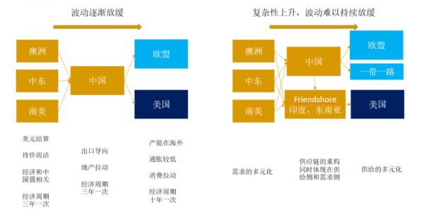 我自己对后面制造业的看法是,短期可能有一些海外萧条的担忧,但长期来看,中国的制造业发展前景,其实不在于说我们的投资情况,而是在于我们的外交情况。我们是个生产国,你和需求国的关系是很重要的,下图左边是昨日的世界,右边是明日的世界。