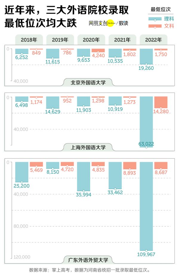头部外语院校的分数线,这几年开始肉眼可见地下降。例如在高考大省河南省,三大外语类院校去年都惨遭滑铁卢。2022 年,上外在河南理科最低录取位次掉落 5 万多名,广外理科暴跌近 7 万多名。