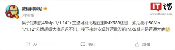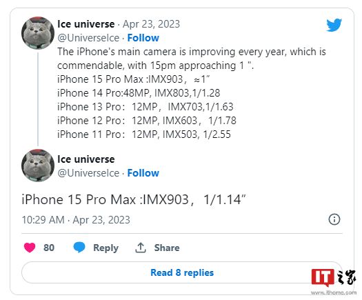 IT之家 4 月 23 日消息,据博主 @数码闲聊站 和 @Ice universe 爆料,苹果今年将推出的 iPhone 15 Pro Max 手机将采用索尼最新的 4800 万像素定制摄像头,比去年的 iPhone 14 Pro Max 的摄像头传感器尺寸更大。