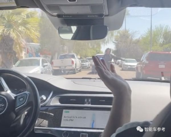 根据视频画面,先是一位交警从摩托车上下来,然后拦下了这台Robotaxi。