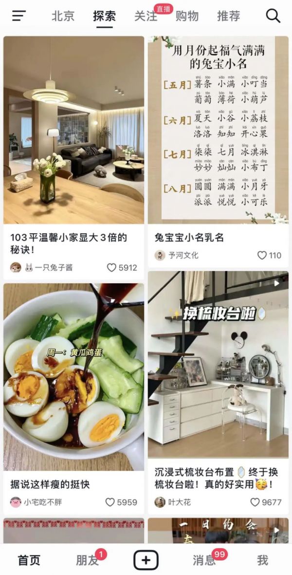 打开抖音APP,首页的导航栏有一个“探索”入口,双列交互,界面功能酷似小红书。开菠萝财经浏览后发现,该版块里图文、图集居多,偶有视频形式,内容以穿搭、美妆、美食、旅行为主。