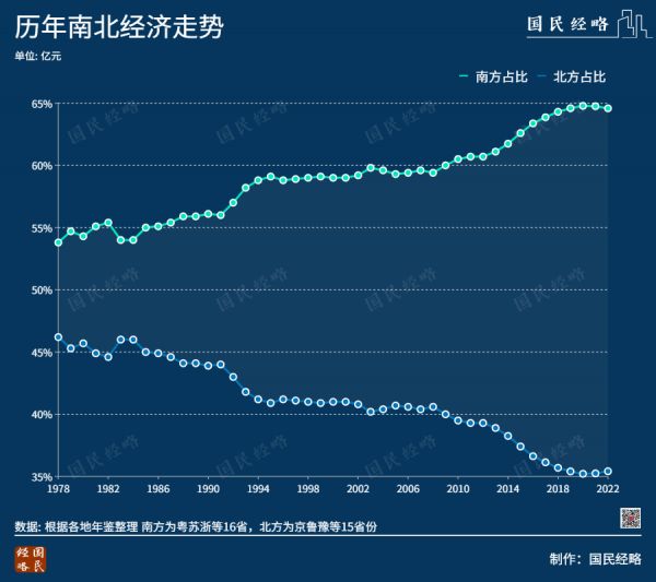 自唐宋以降,全国经济重心就在持续南移。这一趋势在计划经济时期一度被打断,北方借助资源优势大力发展重工业,在全国经济版图中比重一度接近50%。