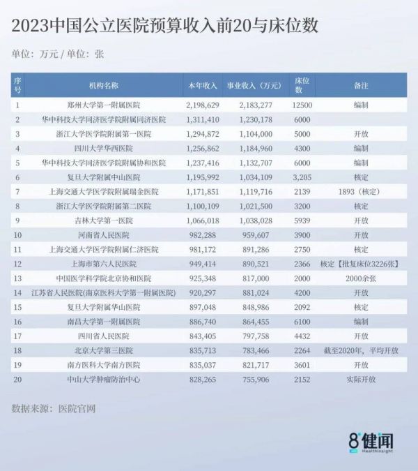 △2023年中国公立医院预算收入前20名与床位数