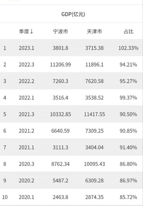 最新数据显示,2023年一季度,宁波以3801.8亿元的经济总量,超过天津的3715.8亿元,排在第11位,首次完成赶超。