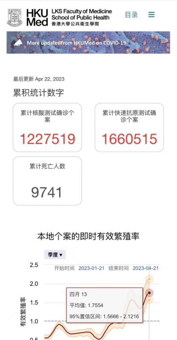 香港大学“2019冠状病毒-众志成城疫情监察计划”,自2023年1月21日,至2023年4月21日的数据。