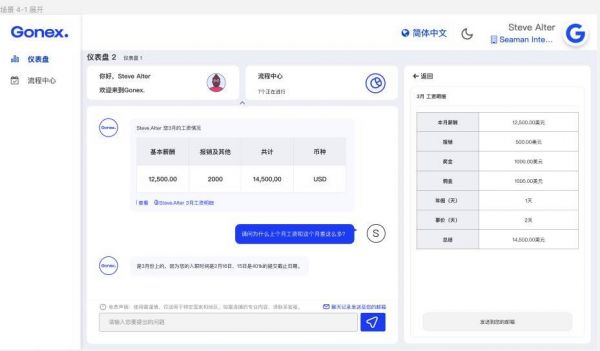 比如我要查一下自己的工资,我到登录系统,点开我的(my account), 查看工资单,选择某一个月或者当月,然后显示自己的工资单,这些步骤是传统的线性工作流。AI可以替代这些工作流,直接问一下我的工资,返回具体的工资数据。如果需要更多交互,可以打开完整功能。