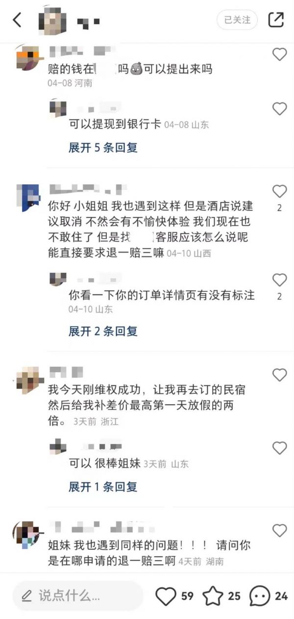 但从社交平台和黑猫投诉相关内容来看,当前已发生酒店民宿退单事件中,不赔偿、赔偿几十元或几百元、按照房价三倍赔偿的情况均有发生。