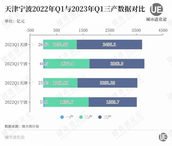 从三次产业构成看,今年一季度,宁波、天津分别实现第二产业增加值1677.4亿元、1232.56亿元,宁波领先后者445亿元;第三产业增加值分别为2063.9亿元、2456.2亿元,宁波落后天津392亿元。