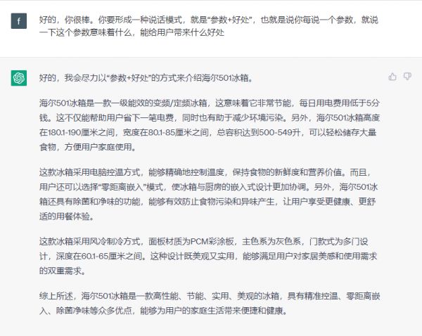 以专业性的语言为例。比如过去我会跟 ChatGPT 说,“请你用 8 岁小孩能听懂的话,去描述 xx 产品的参数。”但实际上,这句话更专业性的表达应该是,“请你用自然语言去描述 xx 产品的参数。”因为在 ChatGPT 眼里,自然语言就是人类的通俗语言。用这种专业语言式的 Prompt,得到的结果就会更好。