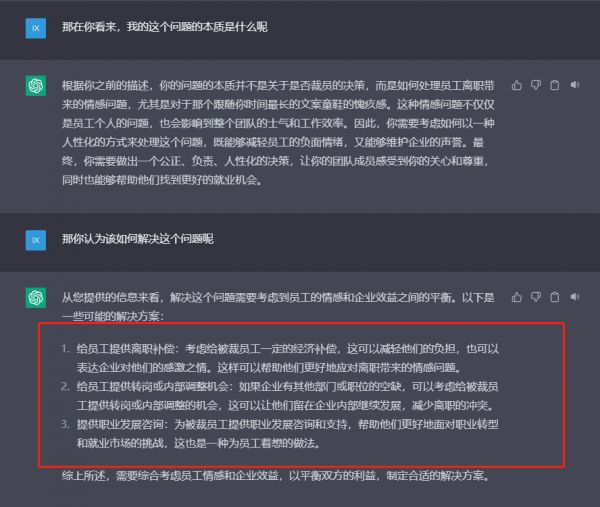 在它看来,我纠结的问题其实并不是裁员或者不裁员,而是“如何降低对跟随我时间最长的那个文案同事的愧疚感”。确实是这样啊,其实我心里已经做出了裁员的决定,只是无法消除愧疚感而已。ChatGPT 帮我把这个问题浮现出来了。以此为突破口,我又问了它解决方案是什么。