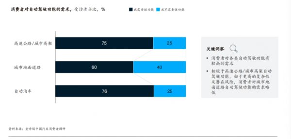 消费者对自动泊车的需求仍然遥遥领先于行车功能,而在行车功能细分项中,消费者对高快速路场景的辅助驾驶的接受度更高。