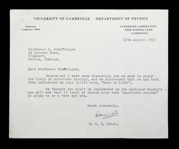 1953年8月12日,克里克将两篇Nature论文寄给了薛定谔,附言中说: