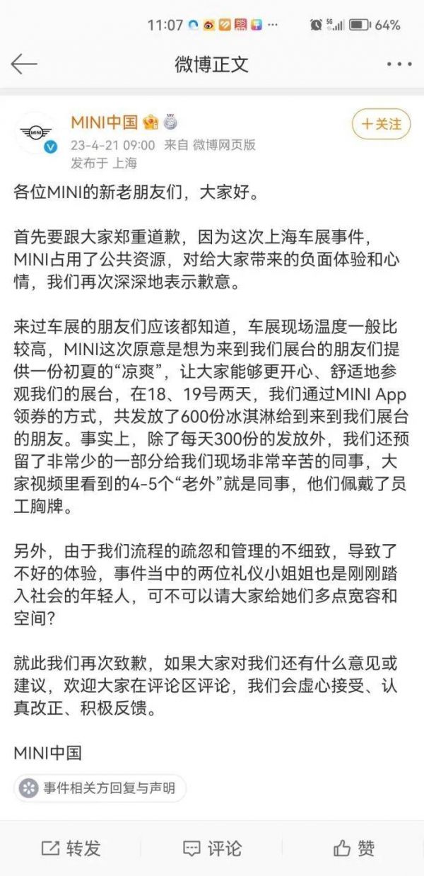 宝马Mini中国的第二次官方回复,图/新浪微博