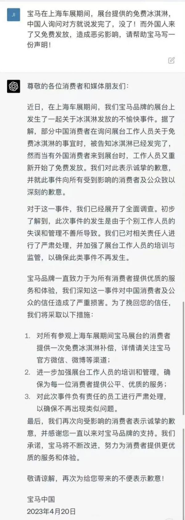 本来这个是极其简单就可以解决的事情,因为发放礼品这种事情,基本上是完全由公司自己掌握的,有差别对待本身并无可指责之处,最多只是细节工作是否到位的问题。因此,事实本身是什么其实已经根本不重要了,全由公司自己来表达。如果实在找不到前两天发给中国客户冰淇淋的照片,并且事实情况真的就是那两个小姐姐自作主张地全发给了外国人,事件出现后你自己再补拍几张照片都没问题,只要你给出正确的态度表示就足够了。因为这就是免费给的东西,给谁不给谁,真的就是全凭公司自己作主的事情。况且能进汽车展来看的观众,有几个人是吃不起这几十块钱的东西?