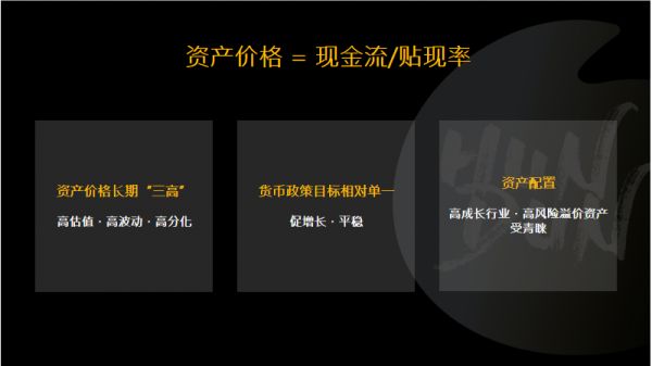 正如我们所知,资产价格=现金流/贴现率,从这一公式可以推理出资产价格长期处于的“三高”状态。在贴现率趋近零的时候,资产价格可以无限大,这首先会导致资产价格的“高估值”。其次,只要贴现率出现微小的波动,就会造成资产价格的“高波动”。另外,由于增长机会没有那么多,只要是稍微好一点的项目就会被疯狂追逐,因此导致“高分化”。在货币政策目标相对单一、只需平稳地促增长的时候,高成长行业、高风险溢价资产会更受青睐。现在情况完全变了,利率会波动,通胀也会波动,那么资产价格会怎么波动呢?一句话总结:未来三到五年没有趋势性机会,有的都是波段性机会。