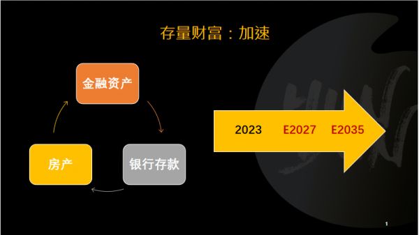 在这种财富新格局底下,整个资产的配置比例也要发生很大的变化。中国的资产配置无非集中在房产、银行存款和金融资产(信托、股票、债券、黄金、大宗商品、数字货币等等)三个方面。2021年以前中国的财富管理行业基本上是跟着中国的经济涨幅在涨,大部分资产都配到了房产上。2021年之后这个局面就被打破了。这是因为,首先,那些能够在一线城市买房的人,基本上已经把两套房子的份额用完了。其次,如果我们把所有的钱都配到房产上,在房地产未来面临问题的时候,就会产生严重的分化与流动性的问题。