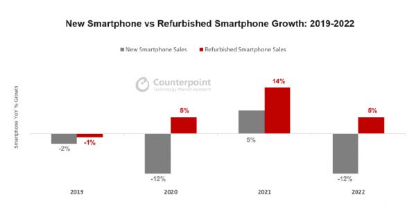 根据Counterpoint Research的最新报告显示,随着大多数地区对翻新手机的需求不断增长,2022年全球二手智能手机市场同比增长了5%。如果不是中国翻新手机销量下降了17%,增长将会更快。