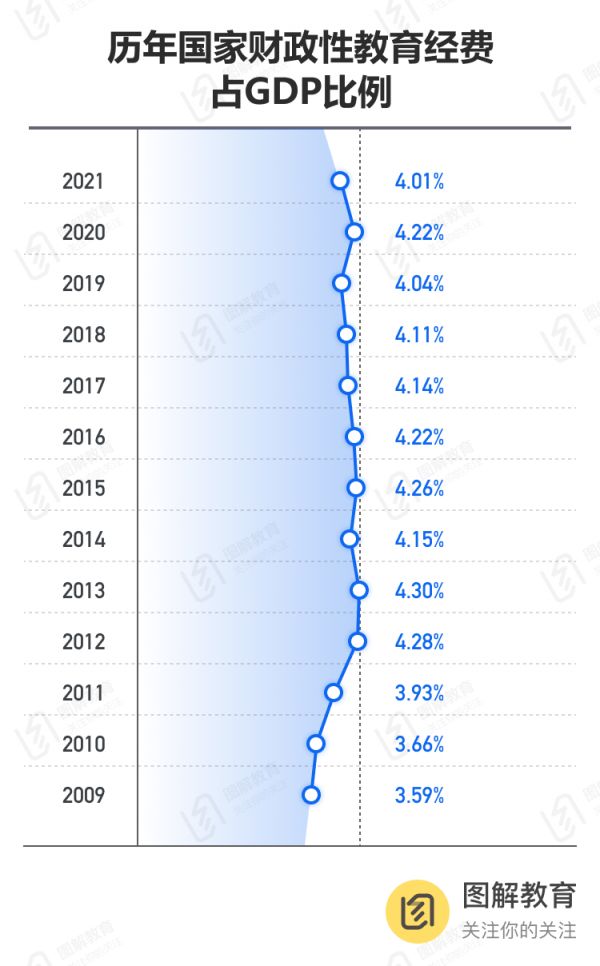 教育投入多寡,体现在国家财政性教育经费占GDP的比例上。数据显示,2021年国家财政性教育经费占GDP比例为4.01%,险守4%,是2012年首次超过4%以来最低的一年。
