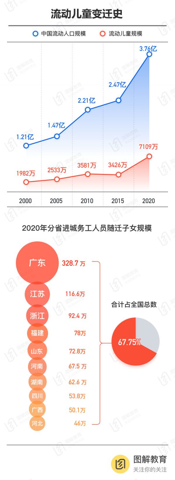 国家统计局第七次人口普查数据显示,2020年,中国流动人口规模达到3.76亿人,带来的流动儿童规模为7109万人,比10年前增长了约1倍,平均每4个儿童中就有1个是流动儿童。