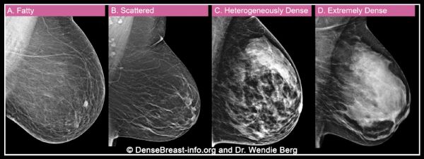 在美国,X线是乳腺癌筛查最主要的影像学方法。乳腺X线检查中,脂肪组织容易透视,呈深色透明状;纤维腺体组织难以透视,呈白色区域。因此放射科医生可以使用以下4种分类,描述女性的乳腺密度: