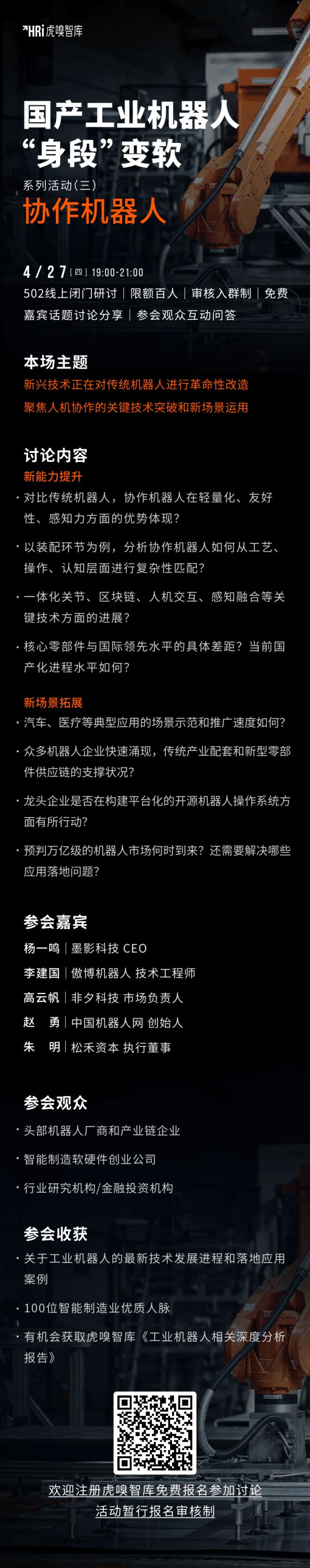 2023年4月27日周四晚七点,虎嗅智库「502线上同行」将邀请墨影科技、遨博机器人、非夕科技、中国机器人网、松禾资本等关键嘉宾,系列探讨工业机器人的柔性化前沿发展,第三期聚焦协作机器人。