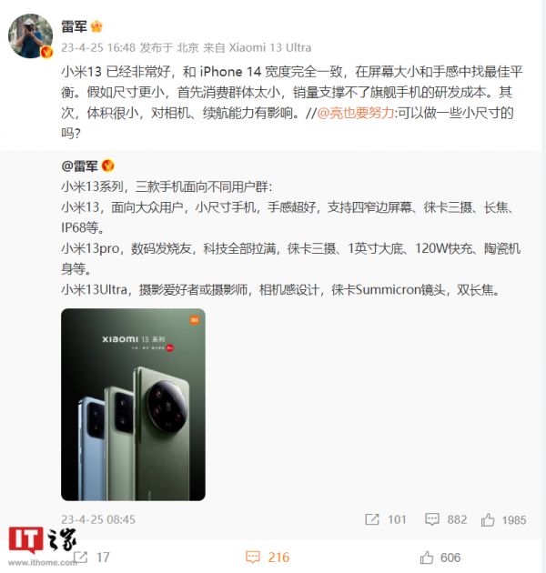 在相关微博中,有网友询问雷军,可以做一些小尺寸的手机吗?雷军对此回应称,“小米 13 已经非常好,和 iPhone 14 宽度完全一致,在屏幕大小和手感中找平衡。假如尺寸更小,首先消费群体太小,销量支撑不了旗舰手机的研发成本。其次,体积很小,对相机、续航能力有影响。”在评论中不少网友认为雷军说得对。