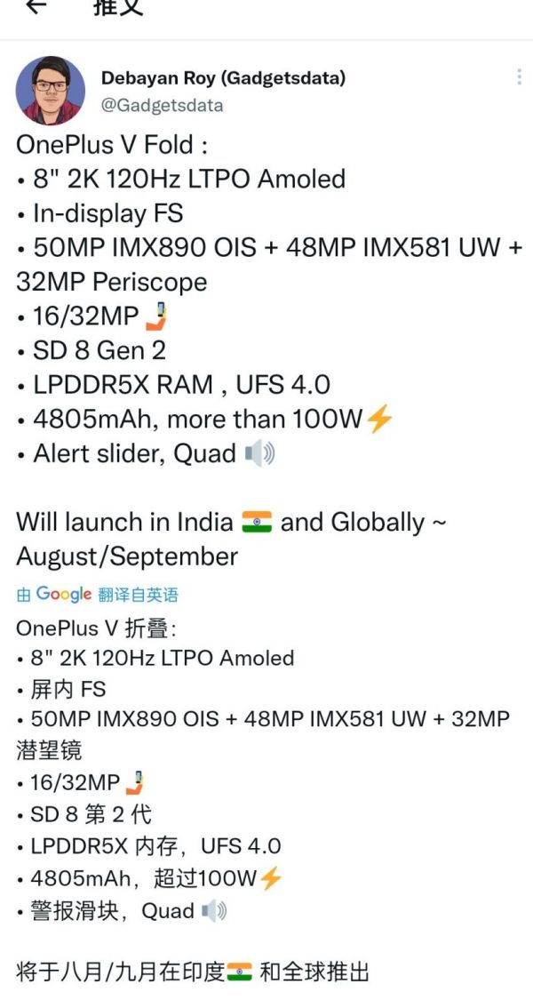 (图源:推特@Debayan Roy)根据Debayan Roy的爆料信息来看,一加首款折叠屏新机将会采用市面上最为主流的“书本式”折叠屏方案,采用内折叠设计,内屏为8英寸2K分辨率、支持120Hz高刷的AMOLED屏,搭载高通骁龙8 Gen 2旗舰处理器,配备LPDDR5x内存+UFS4.0闪存的高性能存储组合。续航方面,内置4805mAh电池,支持超100W快充。在影像方面,OnePlus V Fold前置将分别搭载一枚1600万像素和3200万像素的自拍镜头,后置则是采用三摄模组设计,包括5000万像素IMX890主摄+4800万像素IMX581超广角镜头+3200万像素潜望式长焦镜头。
