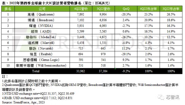 4月25日消息,市场研究机构TrendForce今日公布了2022年四季度全球前十大IC设计厂商的排名,高通、博通、英伟达为前三厂商,联发科排名第五,韦尔半导体排名第十。