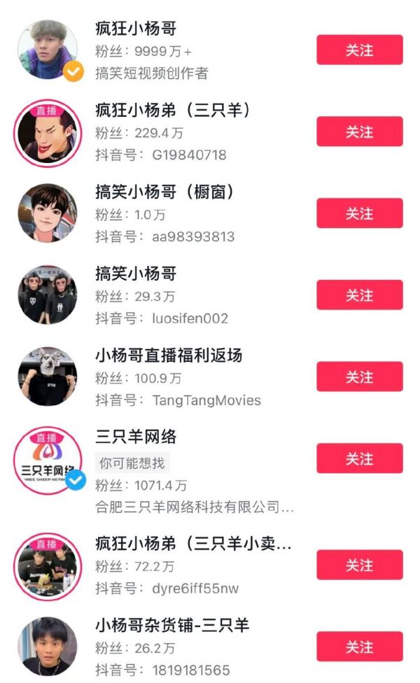 而在小杨哥的有意布局之下,成百上千个小杨哥正在疯狂出现,比如“搞笑小杨哥”“疯狂小小杨”“疯狂小杨弟”……去年年底,新榜数据曾经做过一次统计,“三只羊”拥有300多个已授权账号,还有近千个在待审核阶段。