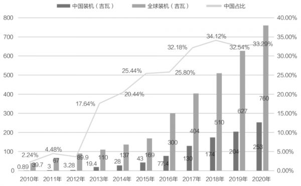 图为2010—2020年中国及全球光伏发电累计装机容量