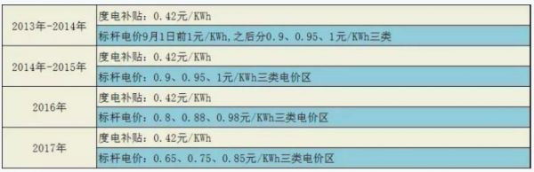 2013年~2017年度电补贴和标杆电价(图源:国家能源局和国家发改委发布文件)