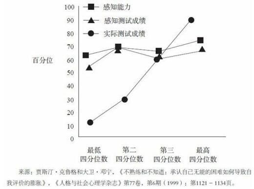 心理学家贾斯汀•克鲁格曾经为学生安排了一个语法测试,并要求他们写下预估的分数。然后教授按实际成绩把学生分为四等,并和他们预估的成绩作比较: