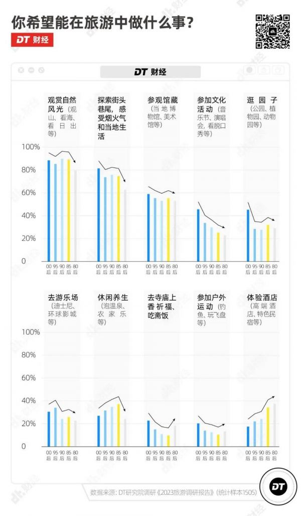 所以在旅游项目上,00后的偏好也更多。除了最多人都选择的观赏自然风光(87.1%)和探索街头巷尾(75%),00后比其他年龄段更喜欢逛园子、去寺庙上香祈福、参加户外运动。