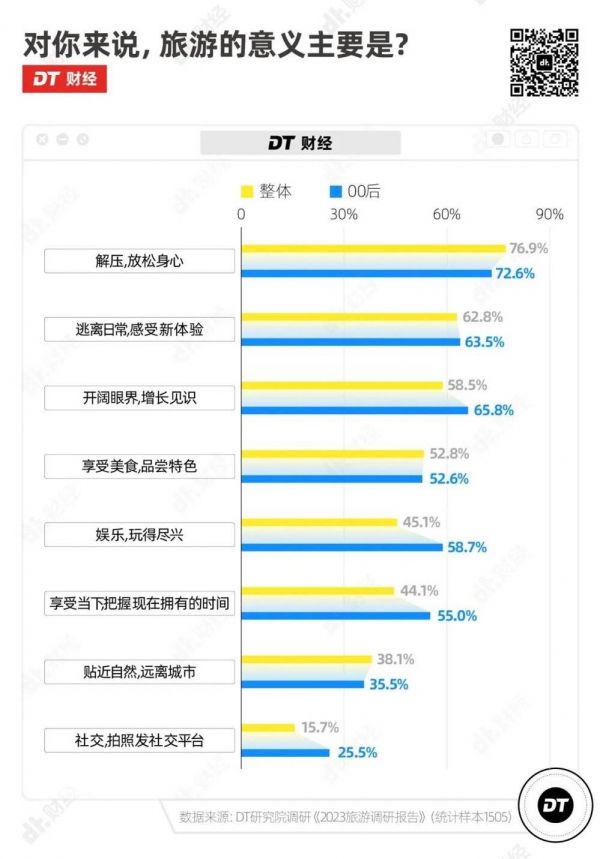 而最想尝试新旅游方式、想要竭尽所能看看更多风景的00后,不仅是出于性价比的考虑,也是因为他们更认同旅游的意义是开阔眼界、玩得尽兴和享受当下。