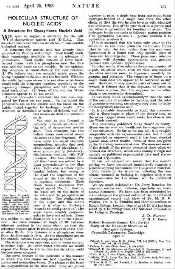 1953年4月25日,沃森和克里克在《自然》杂志上发表了题为《分子的结构和生物信息的传递》的论文,在里面着重阐述了DNA双螺旋结构,一时之间在生物医学界引起了沸腾。在后来,DNA双螺旋结构更是和相对论、量子力学,一起被誉为“20世纪最重要的三大科学发现”。