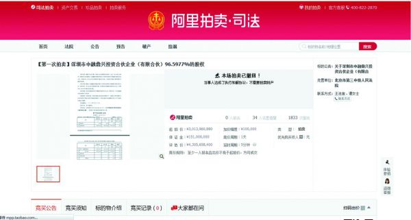 新京报记者从阿里司法拍卖官网获悉,韬蕴资本持有的深圳市中融鼎兴投资合伙企业(有限合伙)(下称“中融鼎兴”)的96.5977%股权将于7月22日至23日被北京市第三中级人民法院公开拍卖。