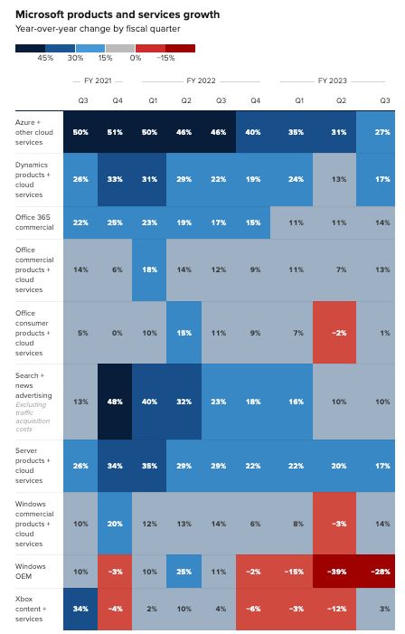 微软本季度分项业务增长情况,图片来自CNBC