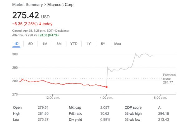 如果单从财报来看,微软和谷歌本次实际上都交出了超出预期的成绩,带动两家盘后股价都一度大涨超过了5%。但在财报发布后的投资者会议后,微软以超强的预期推动股价一度大涨10%,谷歌则因广告业务前景不明出现明显回落。
