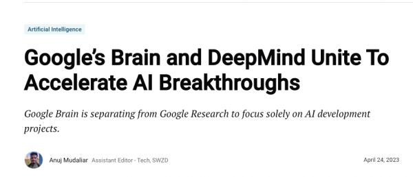 上周,谷歌宣布将谷歌研究院之下的谷歌大脑(Google Brain)和DeepMind合并,共同发力AI研究和应用。为的就是把谷歌的人才、资源整合到一个团队中,提速AI研究。两家合并之后,目前领导谷歌AI工作的Jeff Dean将担任谷歌的首席科学家,直接向Pichai汇报工作。