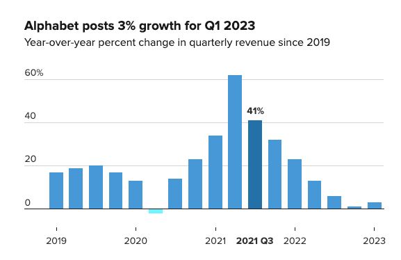 虽然总体看来谷歌本季度业绩并未继续恶化,但如果我们拉长时间线,会发现谷歌目前仍然没有走出低迷的状态,并且关键业务面临的挑战还更大了。谷歌本季度3%的营收增长,是自2019年来第三慢的营收增速。